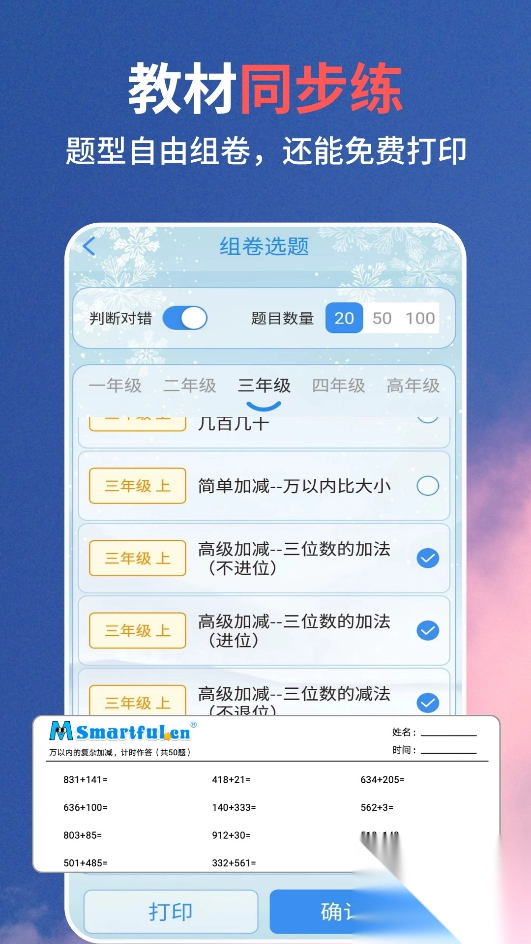 1、系统自动记录完成时间和正确率,支持分数、万以内加减法等多种题型。