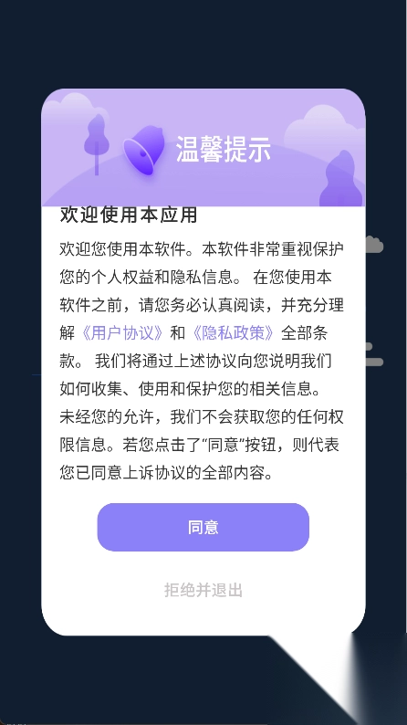 1. 下载并安装APP,点击同意,即可进入主页面;