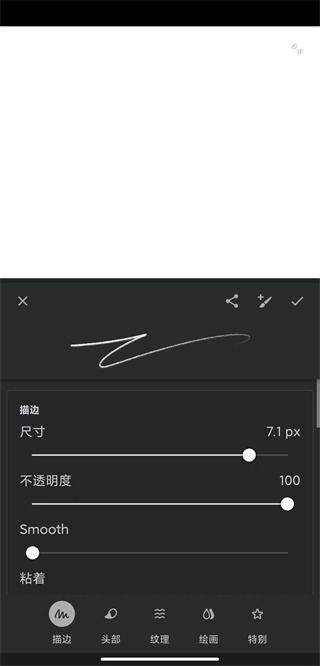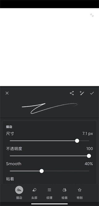4、在此页面找到SMOOTH字样,它就是画笔平滑度的设置比例,设置在30%-50%左右就差不多了,太高了效果反而不好,设置好之后点击右上角的勾即可。