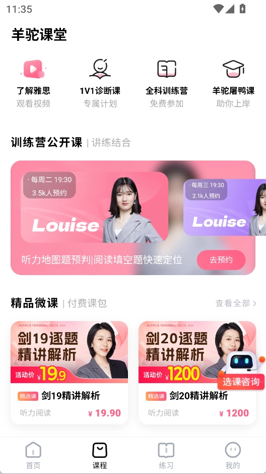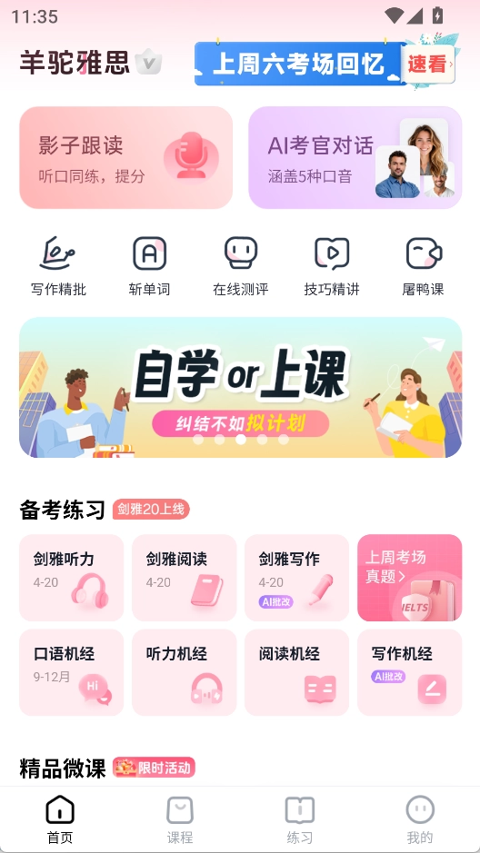 羊驼雅思是专注雅思备考的学习工具,覆盖听说读写全科目训练,通过AI技术与丰富资源助力提分,听力提供精听泛听模式,支持逐句变速播放,口语融入影子跟读法,从流利度、发音维度评分并指出问题,阅读包含剑桥真题练习,写作配备高分范文与指导,题库按场景分类,形成一站式备考体验。