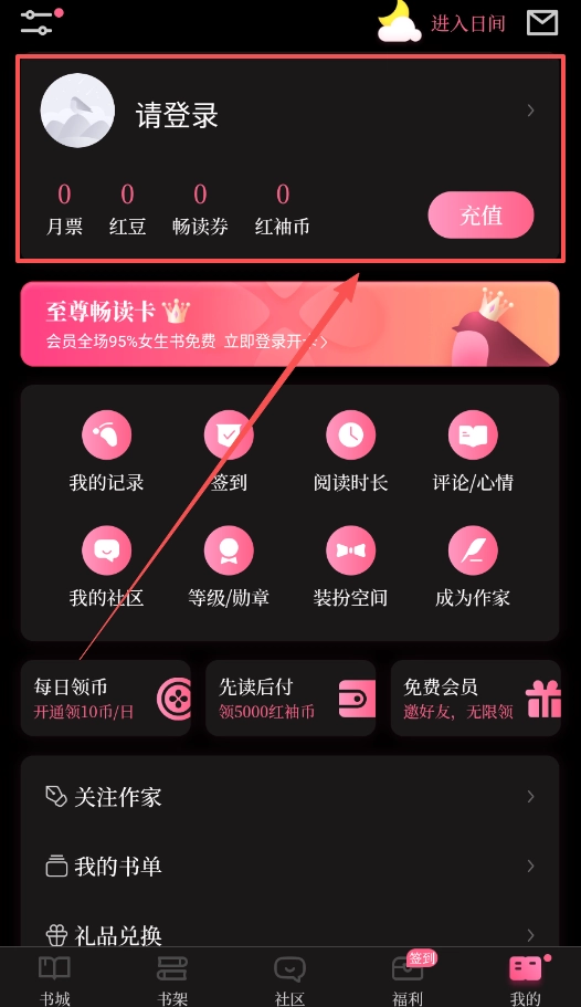 1、首先要进行登录操作,登录成功后,“我的”页面内所有涉及资源获取的功能,以及兑换奖励等关键途径都会开启。