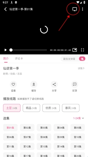 4.在播放详情页,点击右上角TV按钮;
