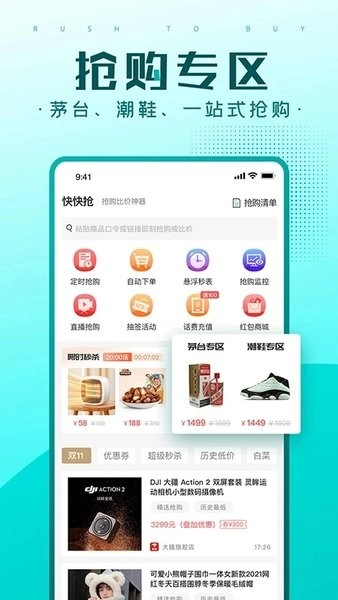 5、快快抢聚合了多个平台的秒杀抢购商品,飞天茅台,热门手机,潮鞋潮玩,一网打尽。