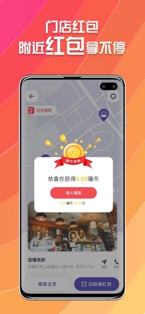 3、进入地图定位界面后,当您靠近实体门店时,系统会自动弹出附近的红包提醒,点击该提醒即可将红包领取到个人钱包里。