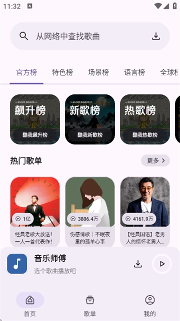 音乐师傅是一款免费好用的音乐播放软件,拥有海量正版音乐资源,支持在线播放。首页会智能推荐热门艺人、新歌单曲等内容分类,遇到喜欢的音乐一键就能畅快聆听。点击歌曲右侧的菜单还能免费使用更多功能,所有资源都没有额外付费要求,为您营造纯粹又便捷的音乐享受环境。