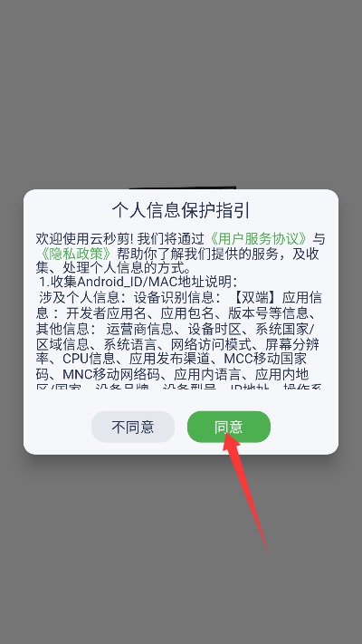 1、首次使用需阅读用户服务协议与隐私政策内容,确认后点击同意按钮进入应用。