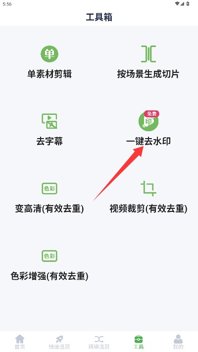 3、进入主功能界面后选择工具箱栏目,点击一键去水印功能进入操作页面。