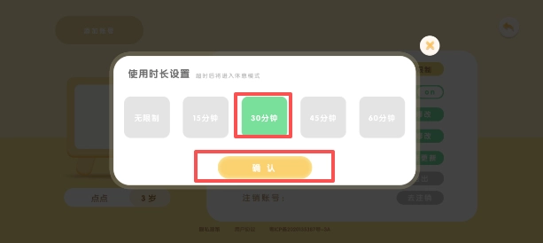 3、点击“使用时长”,选择想要设置的时间并找到页面上的“确定”。