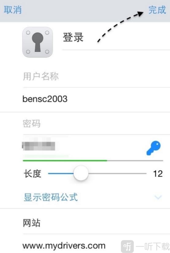 8在登录界面准确录入账号、密码及相关网站信息后,点击“完成”按钮以存储密码数据。