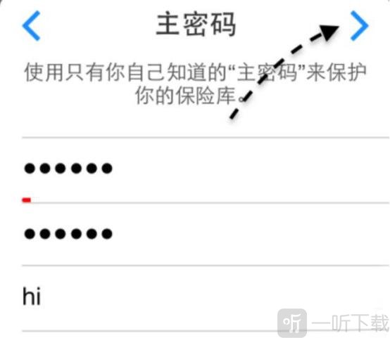 2、接着,我们设置1password的登录密码以及密码提示,随后点击右上方的“>”按钮。