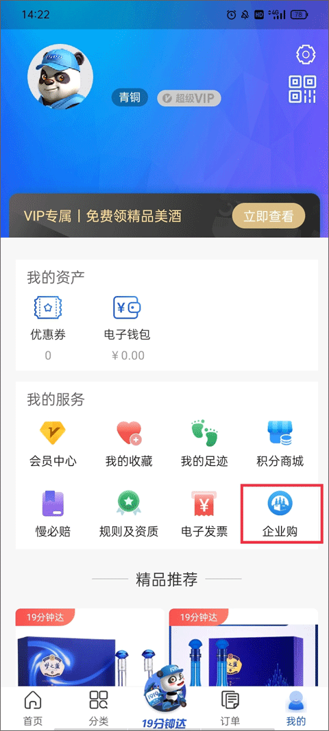 1、点击应用主页底部菜单栏里的【我的】,再选择我的服务板块下的企业购选项。