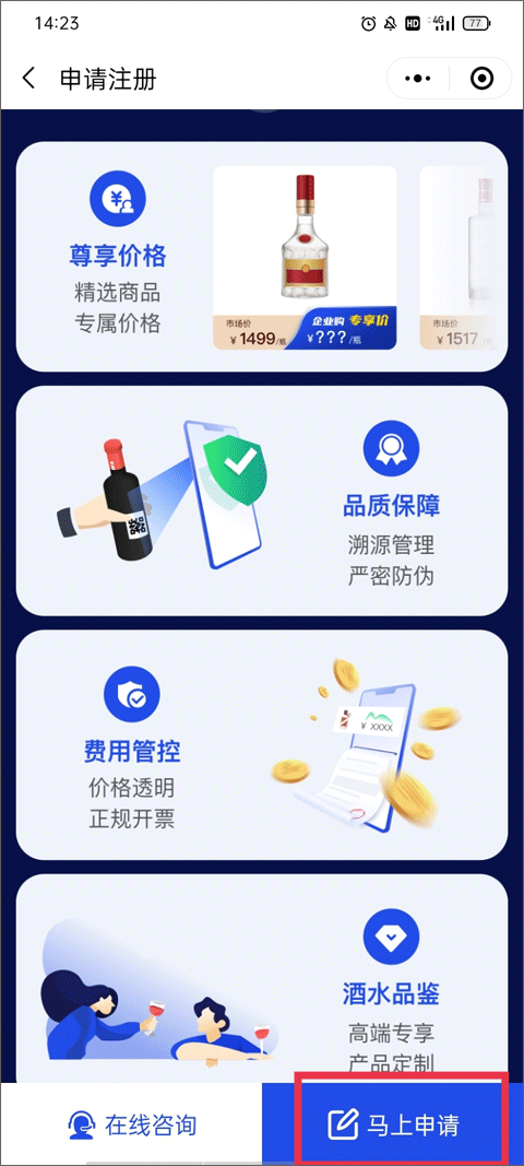 4、了解企业入驻可享有的权益,如尊享价格、品质保障、费用管控以及酒水品鉴等,点击“马上申请”。