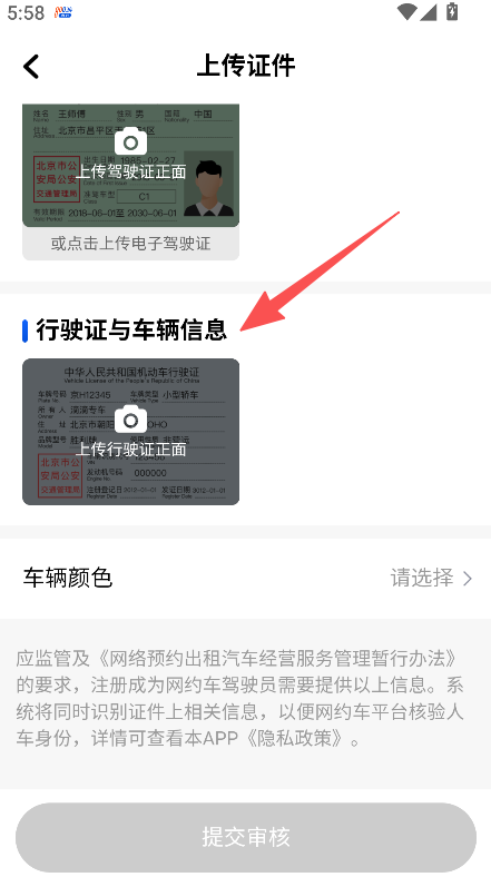 2接下来进入证件上传步骤,需要依次提交驾驶证的正面照片以及行驶证的正面照片。
