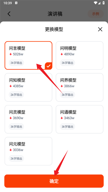 4、比如演讲稿这类内容。像图里展示的那样,第一步是选择【模型】选项,从前面提到的那些模型里挑选一个,接着点击确定按钮。