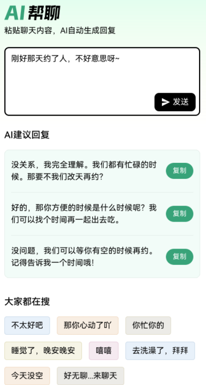在输入聊天内容后,AI会给出不同类型的回复信息,同时提供多个可供选择的回复选项,点击“复制”按钮就能把回复内容复制到剪贴板中。