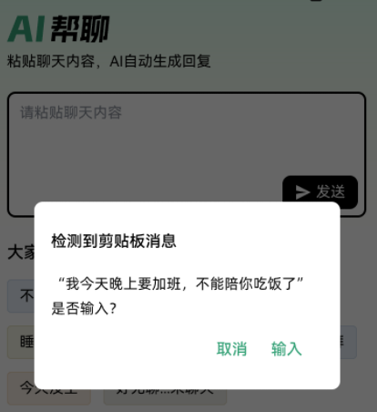 当从其他应用复制内容后,AI辅助聊天的界面会自动识别剪贴板里的信息,并主动询问是否要将其填入对话输入框。