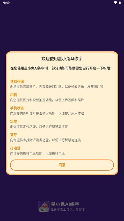 1用户启动星小兔AI练字应用后,需先对用户协议及隐私政策进行确认并完成登录操作,方可进入应用使用相关功能。