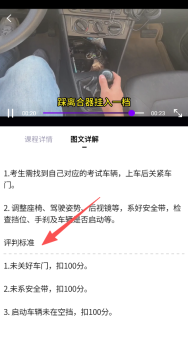 2、教学形式多样,不仅有实拍视频直观呈现操作过程,还配有课程详情与评判标准的文字解析,能适配不同的学习习惯,助力学员更深入地理解驾考知识。