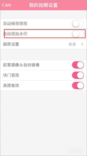 5、把设置栏里显示的自动添加水印按钮关闭后,拍摄的照片就不会有水印了。