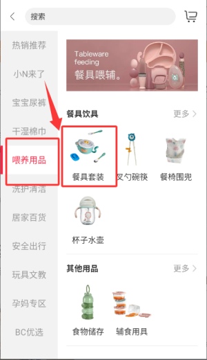 4在分类选项里找到喂养相关的用品类别,从中浏览包括餐具组合在内的各类具体商品。