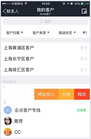 可以对客户进行按归属来源跟进状态等的筛选、排序,也可以新增分组或者对单个客户左滑进行将归属权转给别的同事、释放回公海、分组等操作,如下图所示: