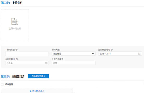 2在操作界面中,可完成合同上传与签约主体信息填写;若已上传合同,也能通过特定功能选项自动识别并填充相关签约方名称,无需手动输入。