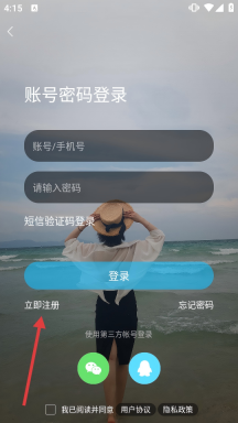 3、在账号密码登录页面,点击【立即注册】选项,进入输入手机号的注册页面。