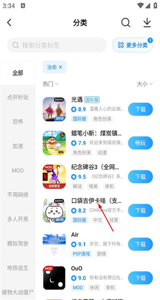 3、进入治愈分类结果页,浏览光遇等游戏作品,查看各游戏的评分、介绍等信息,挑选感兴趣的游戏。