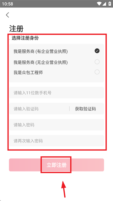 在注册页面,首先需要确定你的注册身份类型,接着依次填写手机号码、系统发送的验证码以及你设置的登录密码,最后点击注册按钮完成整个注册流程。