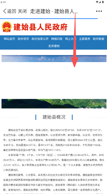 3、系统会自动跳转至“建始县人民政府”官网的建始县概况页面,通过上下滑动屏幕即可浏览详细内容。