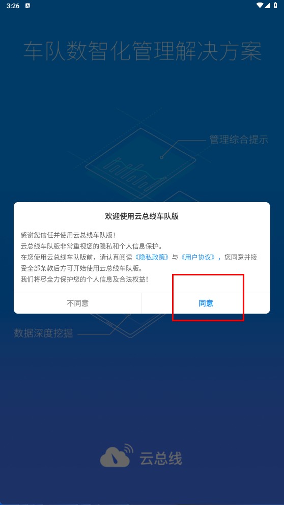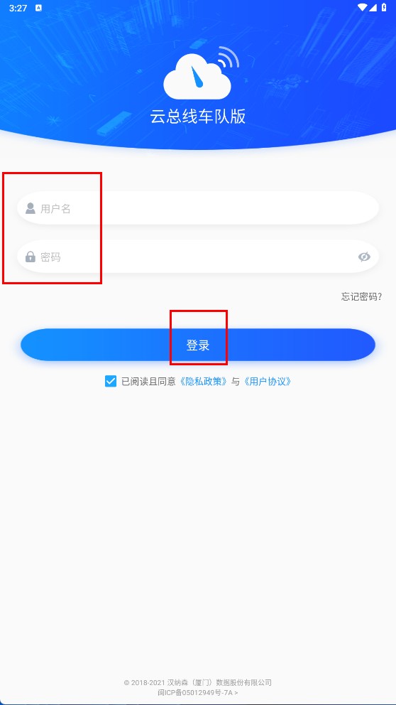 3、进入登录页面后,依次填写【用户名】和【密码】,在确认已勾选相关协议的前提下,点击【登录】按钮,即可进入云总线车队版系统。