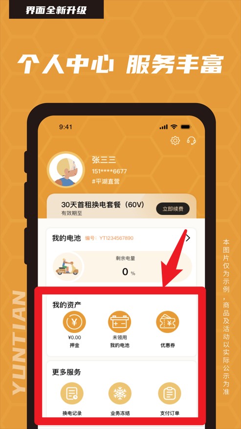 3进入个人中心页面,用户能够查询押金、所持电池、优惠券等各类资产相关信息,同时还能通过页面内的更多服务入口,开展各项业务操作。