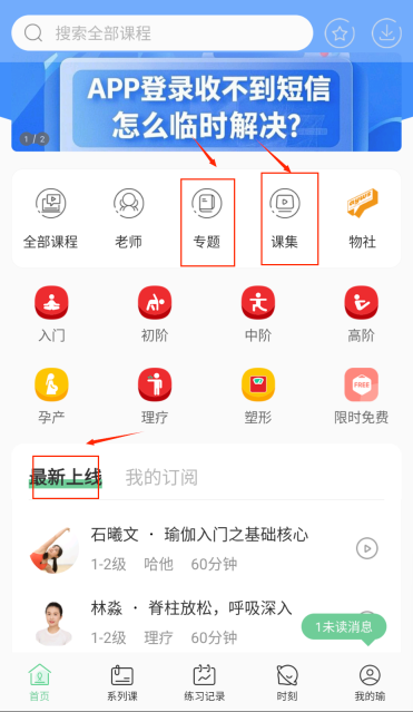 1、选课主要在首页进行:最新上线、课集、专题推荐这三个模块,能帮你快速找到准备在全是瑜开启首次练习的课程。
