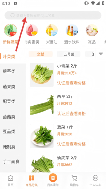 2、进入商品分类页面后,点击页面顶部的搜索栏,输入关键词【西兰花】,随后执行搜索操作。