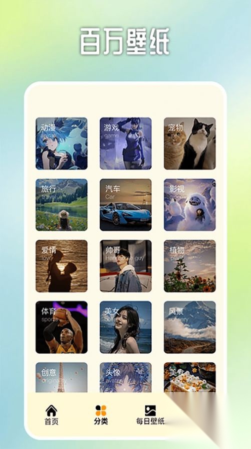 1为了让用户能更便捷地定位到心仪的壁纸,平台会对所有壁纸资源进行细致的类别划分。