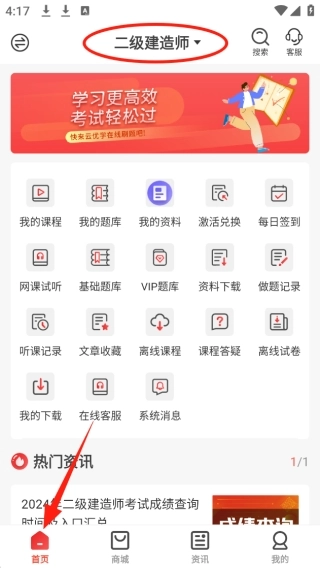 1、进入首页后,最上方设有考试类别调整入口,可随时切换;首页内整合了你的各类课程与题库资源。