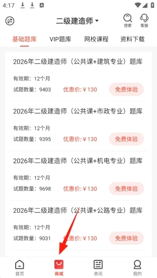 2、在底部“商城”栏目中,你可以购买专业相关的各种题库,可以先免费体验之后再购买;