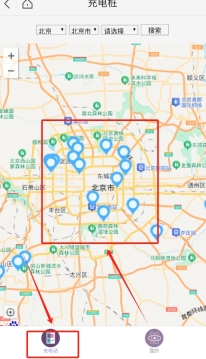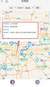 2选好地区后返回首页,地图上的蓝色图标就代表附近充电桩的具体位置。