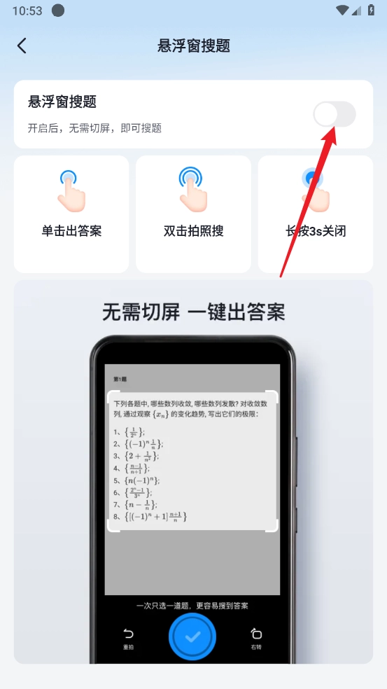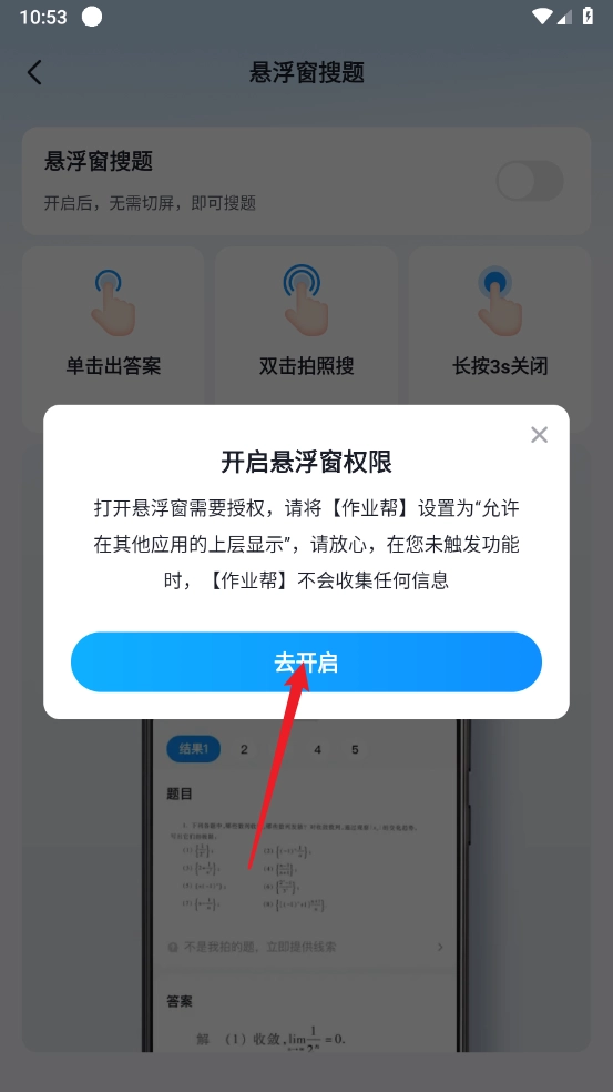 2、进入后开启"悬浮窗搜题"的开关。