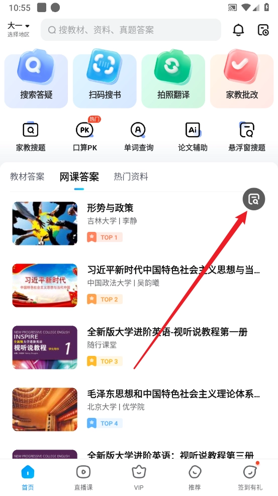 1、首先打开作业帮软件,进入到首页中后可以切换到直播课、VIP、推荐、我页面,我们点击右下角的【我】。