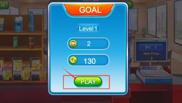 2、点击红色框内的绿色PLAY键,达成接待2个顾客并获得130元的目标即可通关。
