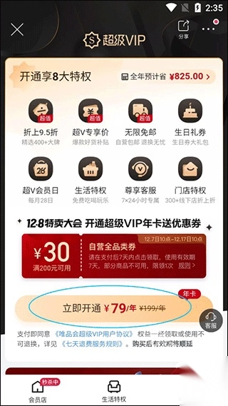 4、超级vip有着普通用户享受不到的8大特权:折上9.5折、超v专享价、无限免邮、生日礼券,每月28号超v会员日、尊享客服、门店特权、生活特权,对于经常购买物品的小伙伴来说非常的实用。