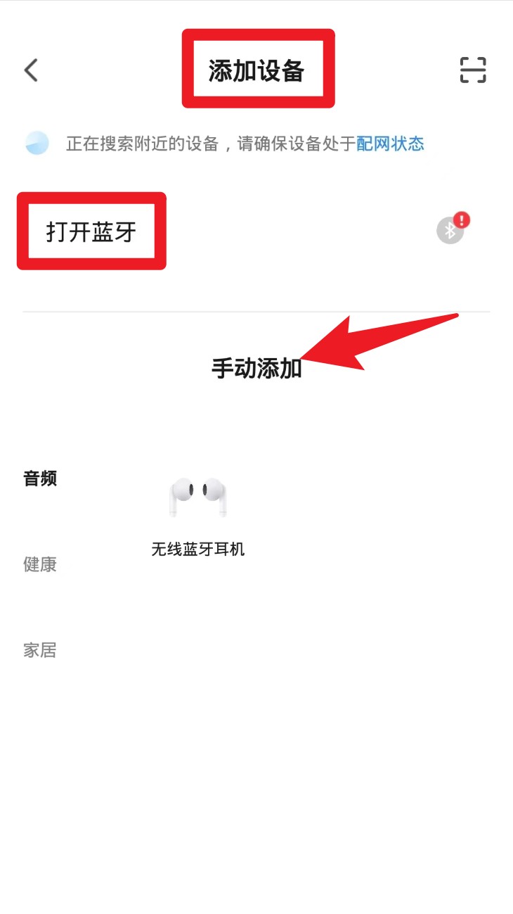 3进入首页后,点击“添加设备”,确认蓝牙已开启,选择“手动添加”目标设备。