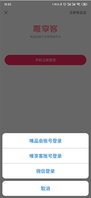 1、在本站完成唯享客的安装并运行,随后通过微信、唯享客或唯品会账号进行登录: