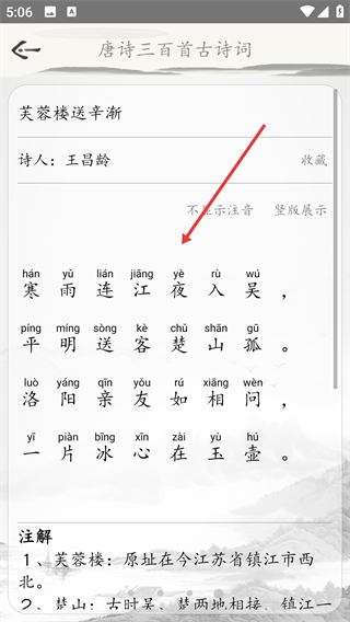 4、在诗词详情页能够查看《芙蓉楼送辛渐》的原文、注释等全部内容,从而知晓这首诗词的含义。