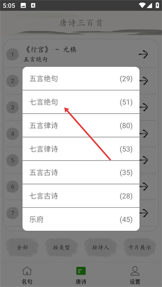 2、在诗词类型菜单里找到并选择【七言绝句】这一选项,随后就会跳转到该体裁对应的诗词列表页面。