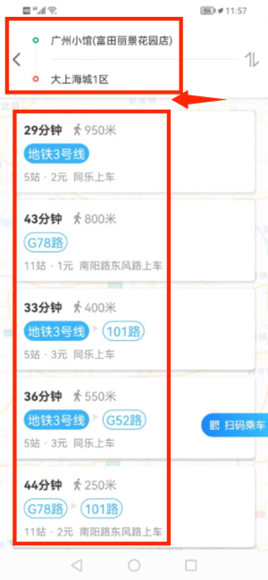 4、规划结果提供地铁及公交等多种出行方案选择。
