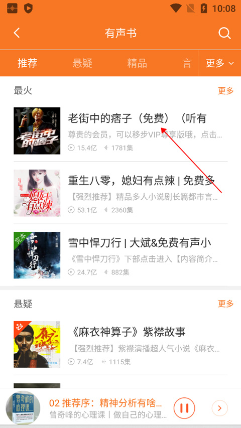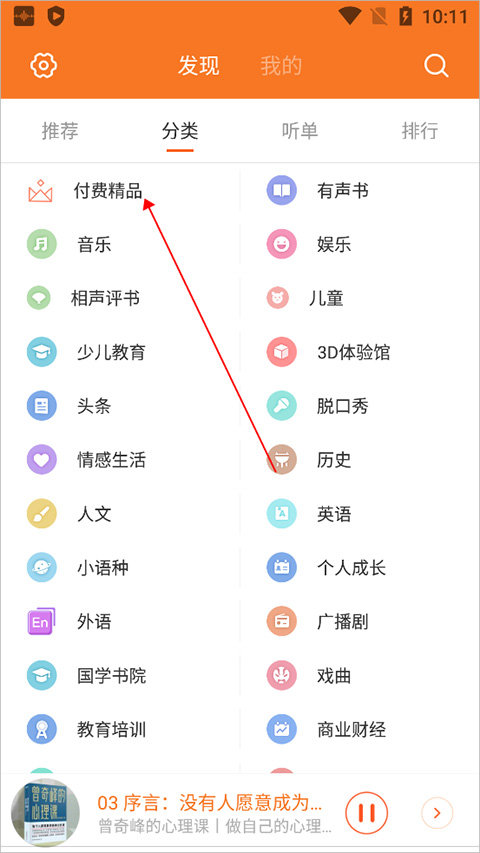 若想让专辑带有付费标识,可通过喜点直接购买该付费专辑,购买成功后即可永久收听此专辑,用户可进入喜马拉雅精品板块的分类页面,找到并点击【付费精品】选项。