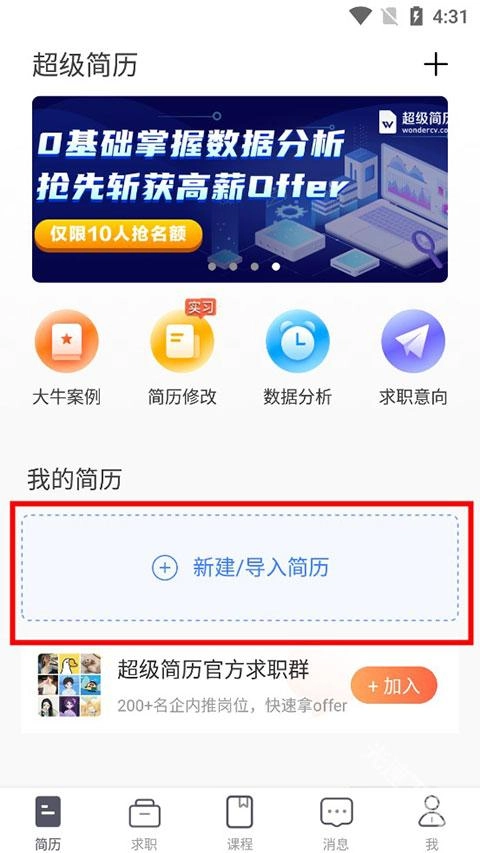 1、首先启动软件,在首页找到“我的简历”板块,点击“新建简历”按钮。