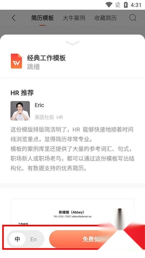 4、选择完成后,选择简历语种,最后点击免费使用。